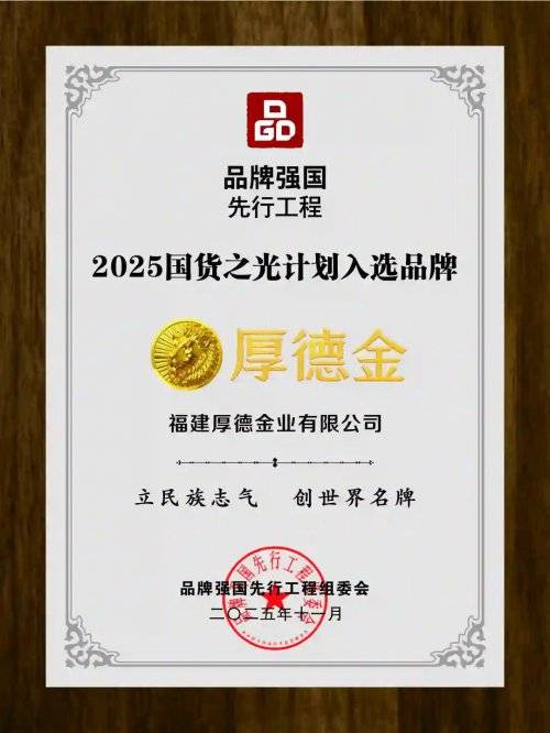 “国货之光计划”是“品牌强国先行工程”的重点工程,代表中国高质量、具有自主知识产权和核心竞争力、在国内外市场享有高度美誉度和广泛认可度的民族自主品牌。德诚珠宝集团旗下“厚德金”品牌凭借在设计创新、匠心制造、文化传承等方面的卓越表现,荣获2025“国货之光计划”入选品牌。