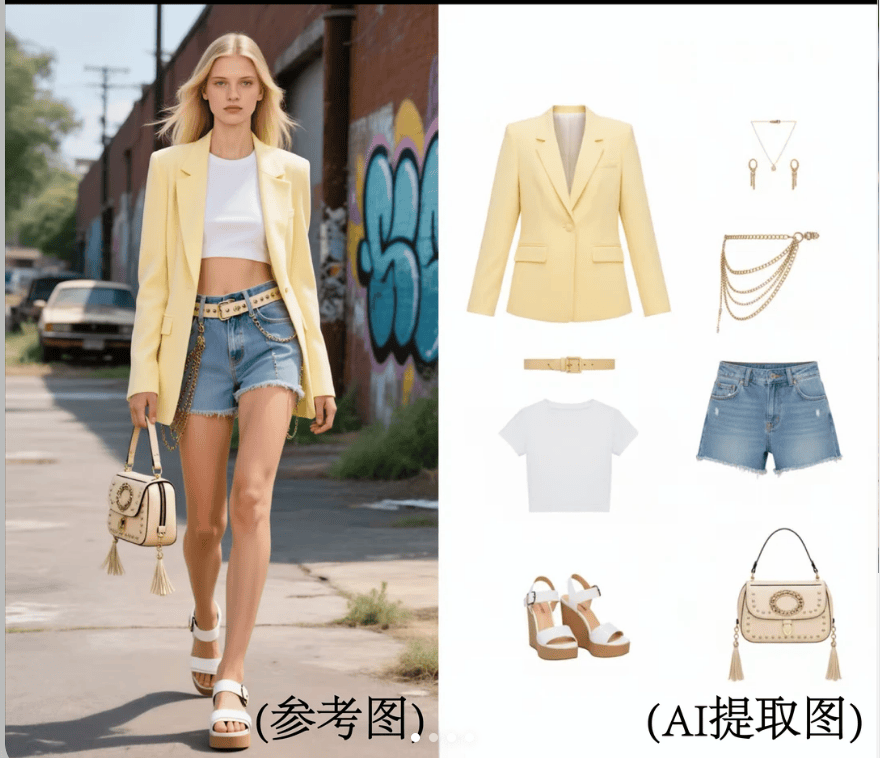 上传一张高清明星穿搭图,系统会在30秒内自动完成衣物提取并生成精修平铺展示图