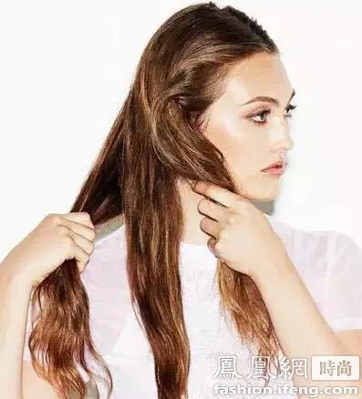 Step3:用手指抓住中间股头发的最低端,将剩下的头发向上推,将头发的弧度弄得更加自然。
