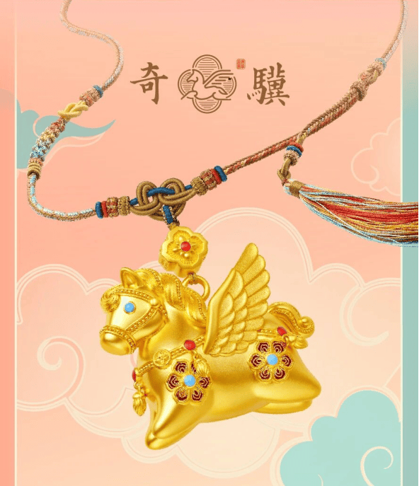 当然打铁还需自身硬,老凤祥能够赢得这么多年轻人认可,离不开紧跟实事的产品。老凤祥近些年来一直在不断推进品牌年轻化转型,产品设计愈发贴合年轻消费群体的审美需求,实现传统美学与现代时尚的巧妙融合。以当前热销的丁禹兮同款老凤祥奇骥系列“唐飞飞”为例,以骏马为原型,兼顾灵动张力与萌趣风格,鬃毛如流云飘逸,腾空姿态极具动感,饰有镂空、鎏彩工艺打造的唐朝宝相花纹样,并且用古法效果立体双翼与古法高精工镶嵌工艺提升了产品精致度与独特性,一经推出便成为了社交平台种草热门,打破了传统黄金品牌“老气横秋”的刻板印象。