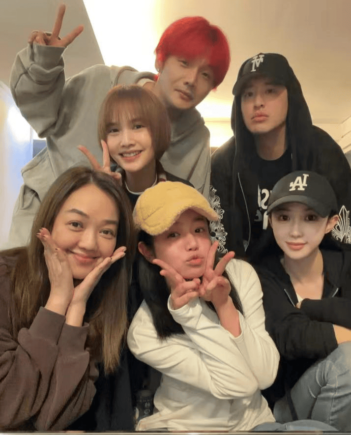 先看这张大合照,几个俊男美女同框确实养眼。杨丞琳短发造型特别减龄,看着像18岁少女,她老公李荣浩一头红发也很抢镜,红红火火很应景。陈妍希坐在宣云和另一位好友中间,比剪刀手嘟嘴卖萌,四十多岁还是少女感满满,不愧是大家心里的姐姐。宣云戴着棒球帽扎马尾,坐在陈妍希旁边,妆容精致颜值气质一点不输旁边的大明星。潘玮柏蹲在李荣浩身边,戴着和老婆同款的情侣帽,穿着同款黑衣,这波恩爱秀得够高调。潘帅这些年一直在减肥,不知道过了个春节有没有再发福。