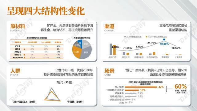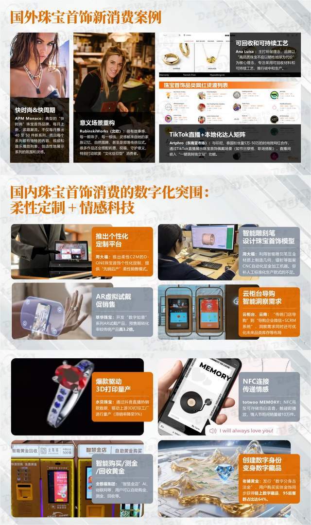 在全球范围内,珠宝首饰具备经典艺术产业化、长周期为快时尚消磨、伟德国际平台百货专柜主导和钻石高占比的特性;而中国则表现为黄金类产品主导、潮符号产业化、水贝模式示范和直播生态闭环的特征。袁岳博士进一步勾勒了国内外珠宝首饰新消费市场的四大解构性变化点:其一是原材料领域的矿产金、天然钻石等原料份额下降,再生金、再生银和培育钻石等显著提升;其二Z世代和千禧一代成为市场成长的主力贡献者;其三直播带货形态对渠道的重塑作用;其四“悦己”场景超越传统的婚嫁和投资动力。相比较而论,数字技术对中国珠宝首饰市场的影响从产品设计、产品美学、生产工艺和渠道管理、用户产品链接的全维度影响。
