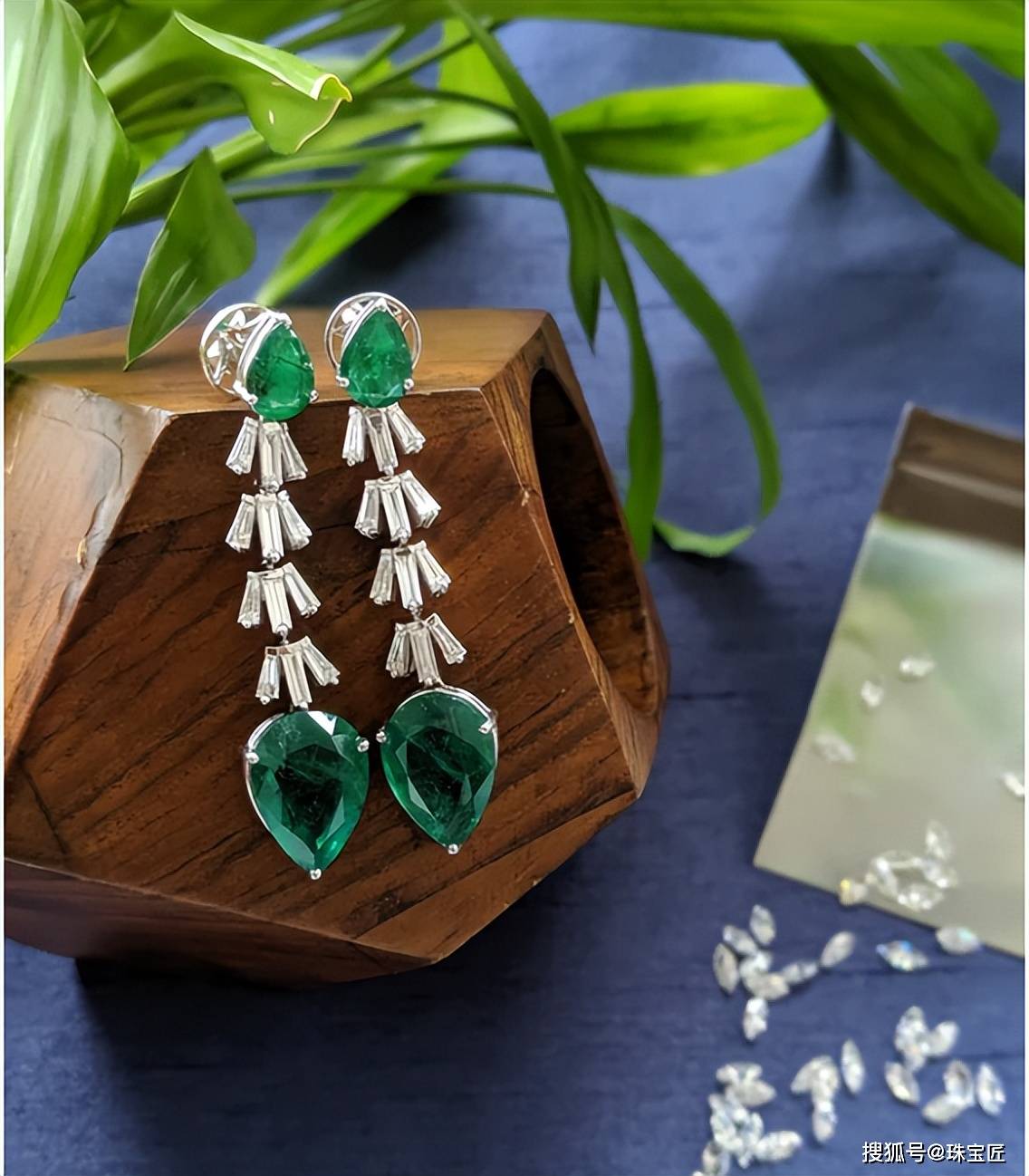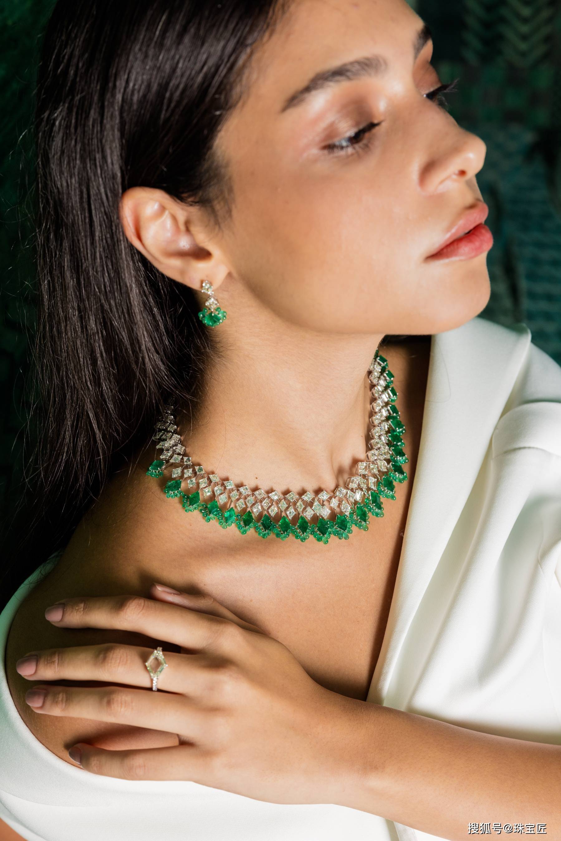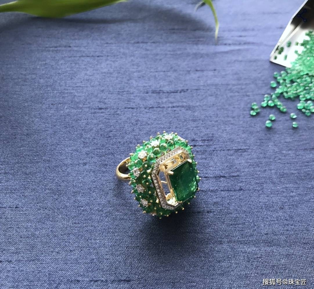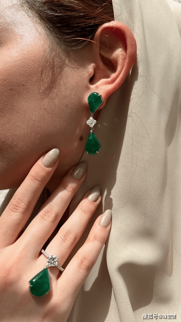 采用三角形切割的钻石,张扬且个性,与祖母绿的经典搭配,营造出一种清新自然的美感。