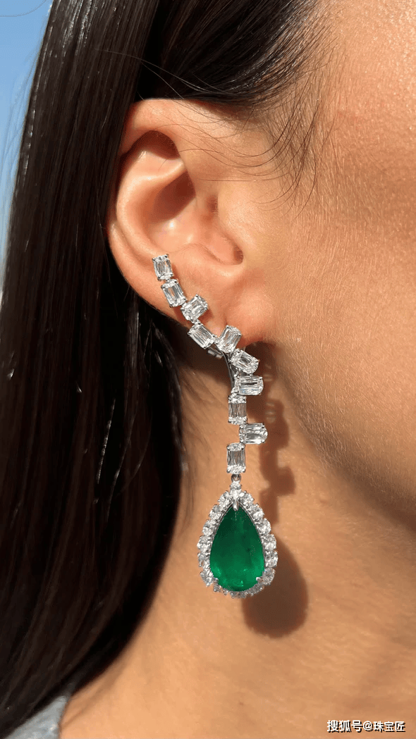 长方形钻石与梯形钻石的巧搭,线条流畅、立体,上下各点缀一颗梨形祖母绿,为整体造型增添了一分精致与锐利。