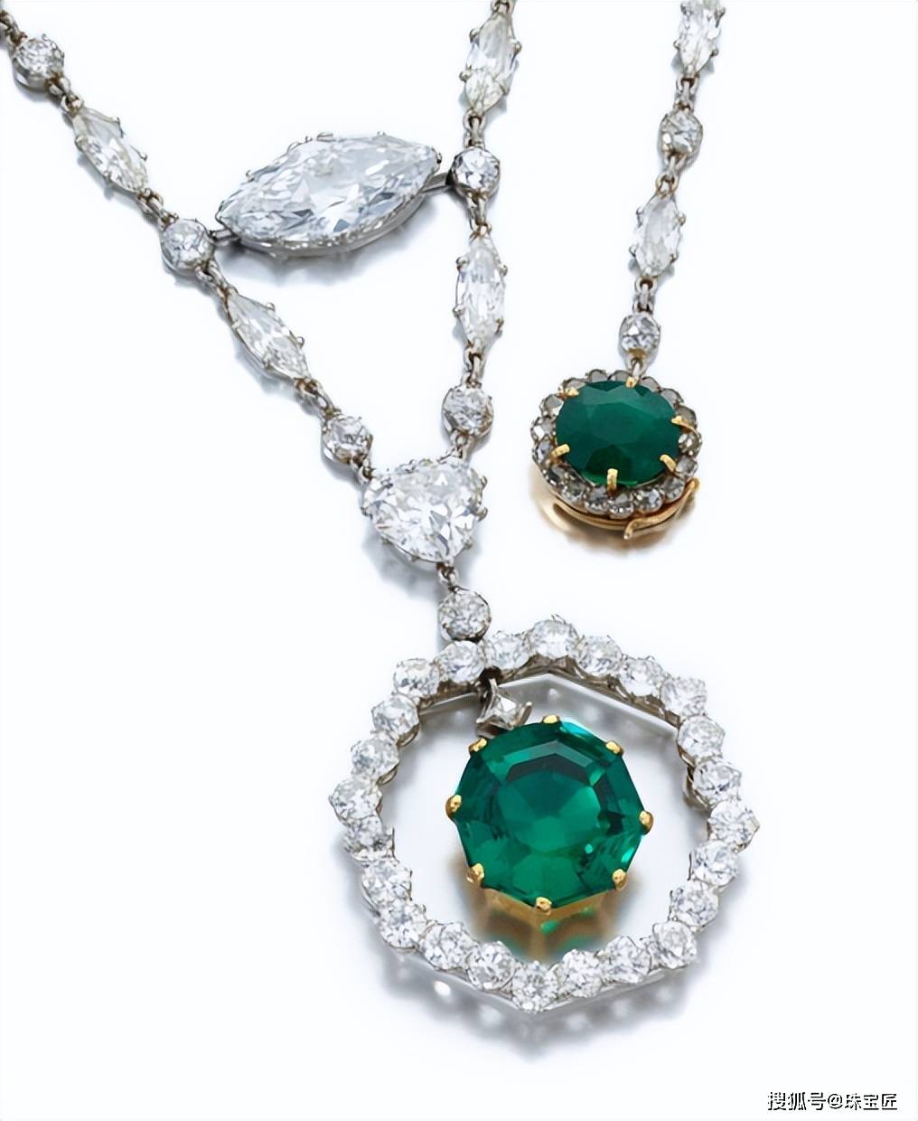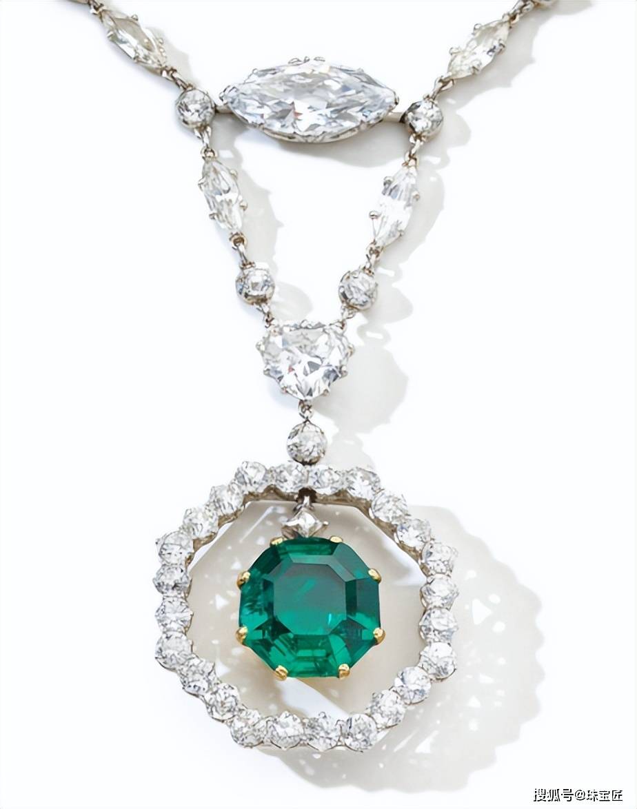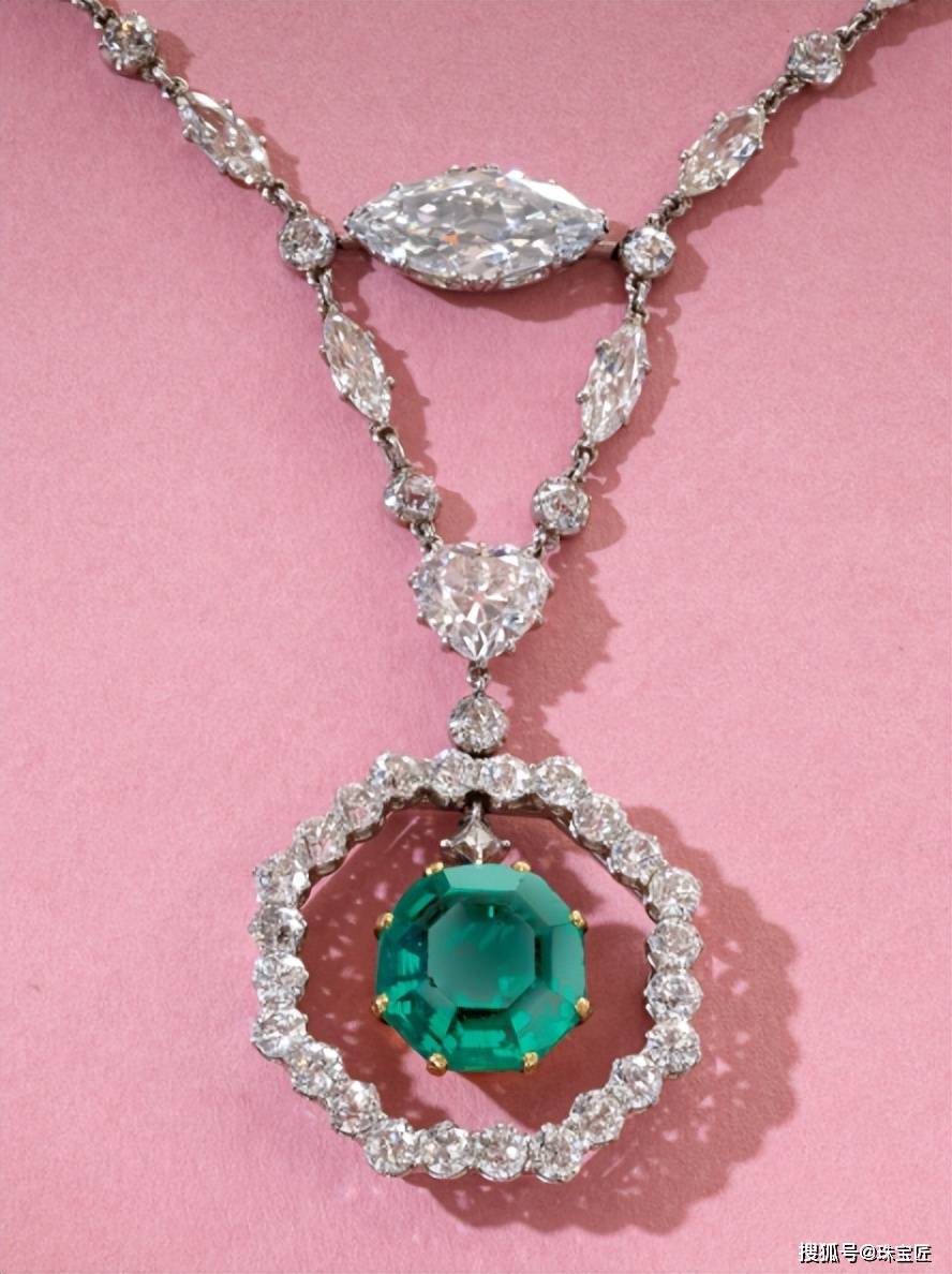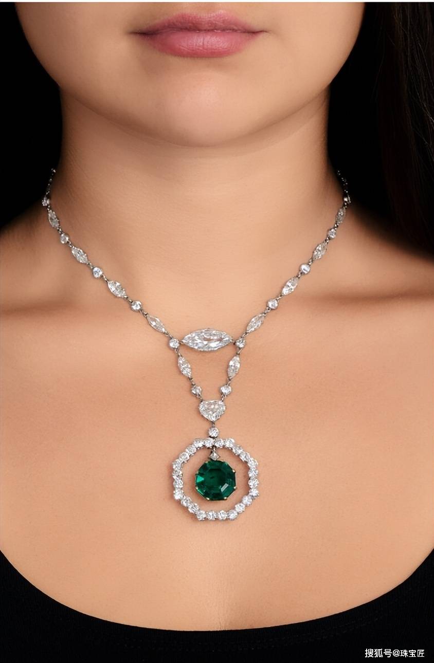 项链由马眼形钻石与圆钻共同镶嵌,正中悬挂一颗重11.78克拉的八角形切割祖母绿,祖母绿原产于哥伦比亚,少油,与扣环部分镶嵌的那颗重2.64克拉的垫形祖母绿相互呼应,款式优雅、高级。