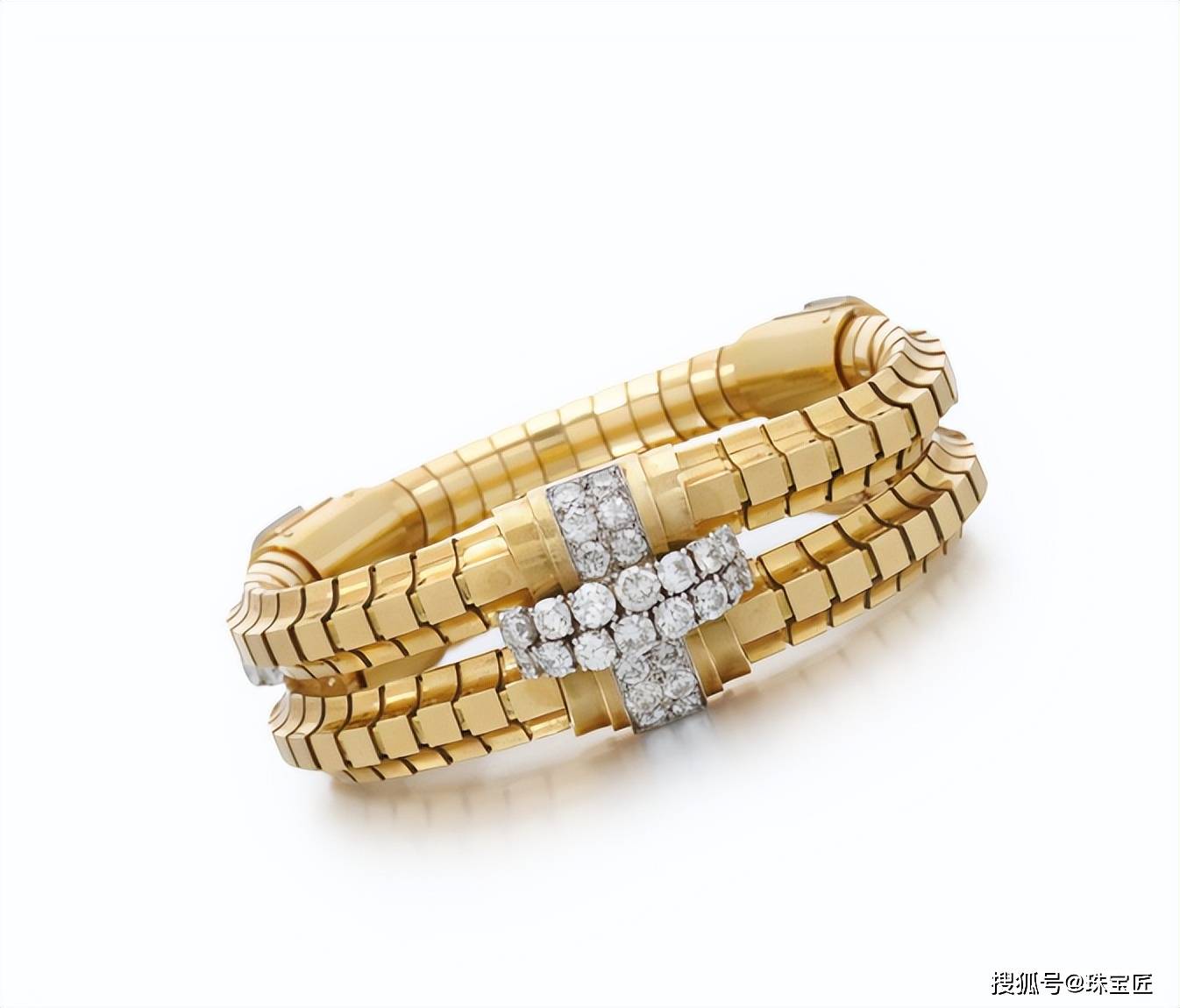 黄金钻石手镯,Van Cleef & Arpels出品,由黄金与钻石镶嵌,正中点缀钻石镶嵌而成的十字图案,整体的线条立体、硬朗,呈现出一种独特的现代感和时尚感;