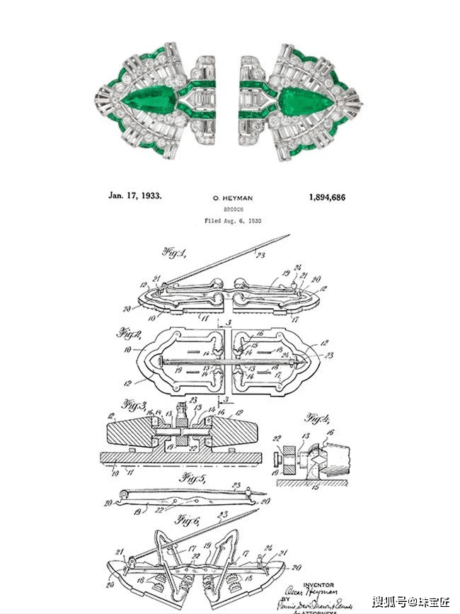 双夹式胸针,是1933年美国珠宝品牌Oscar Heyman的创始人Heyman兄弟,发明的一种胸针款式,并成功申请专利,曾在20世纪广为流行。