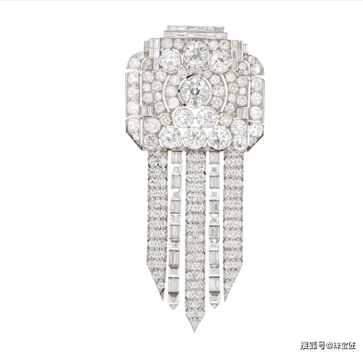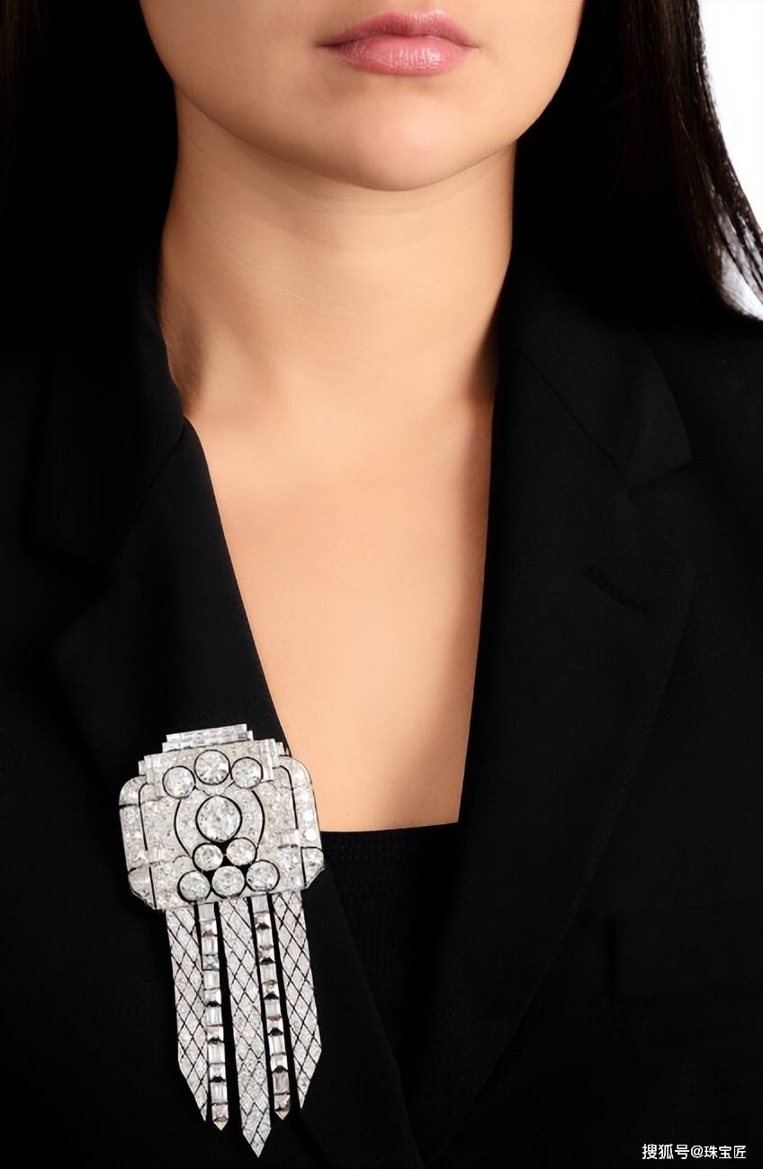 严谨的几何构图与密镶钻石,营造出强烈的视觉冲击,既有艺术装饰性,又彰显出高贵典雅的气质,是 Art Deco 风格珠宝中极具代表性的作品。
