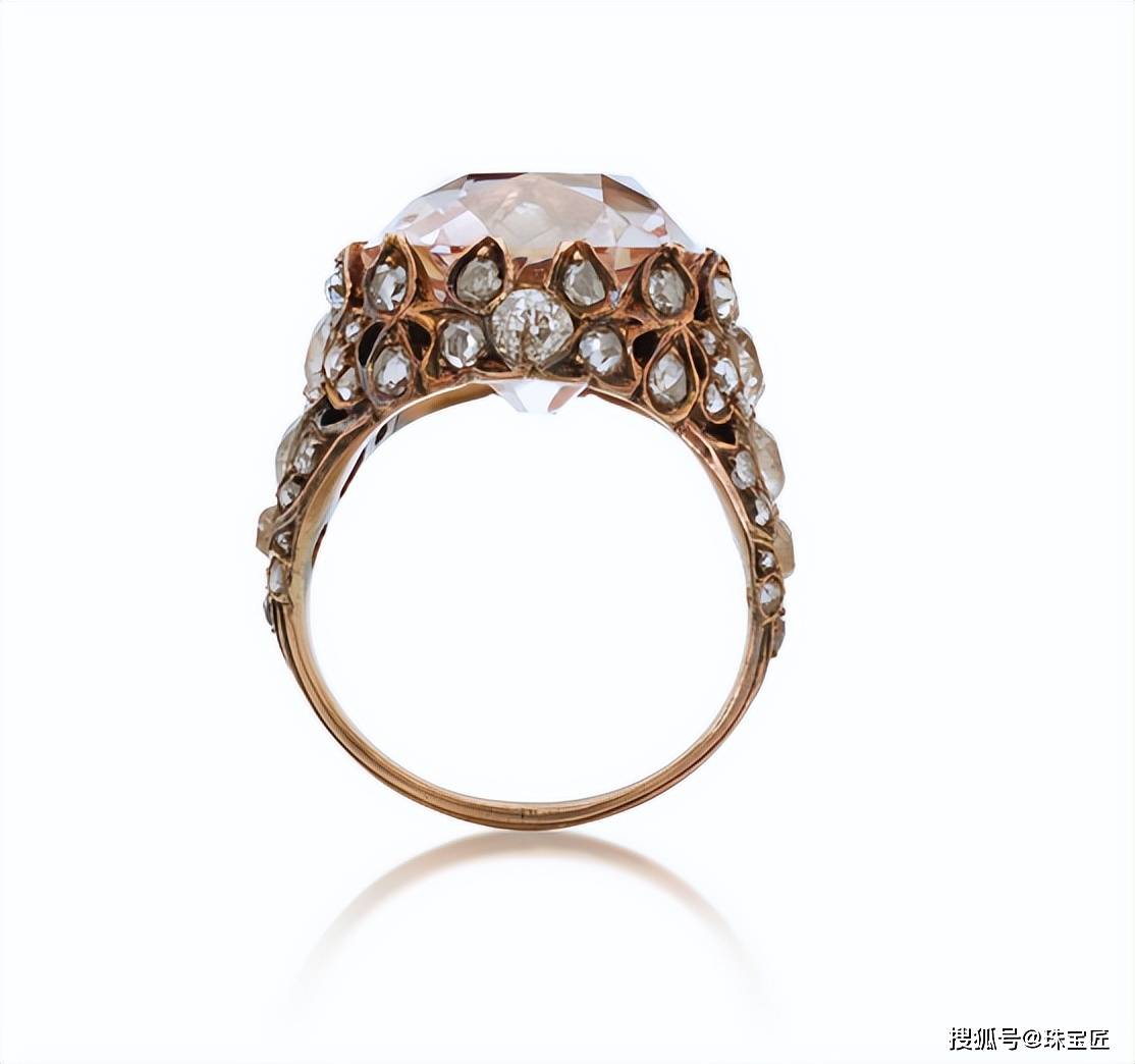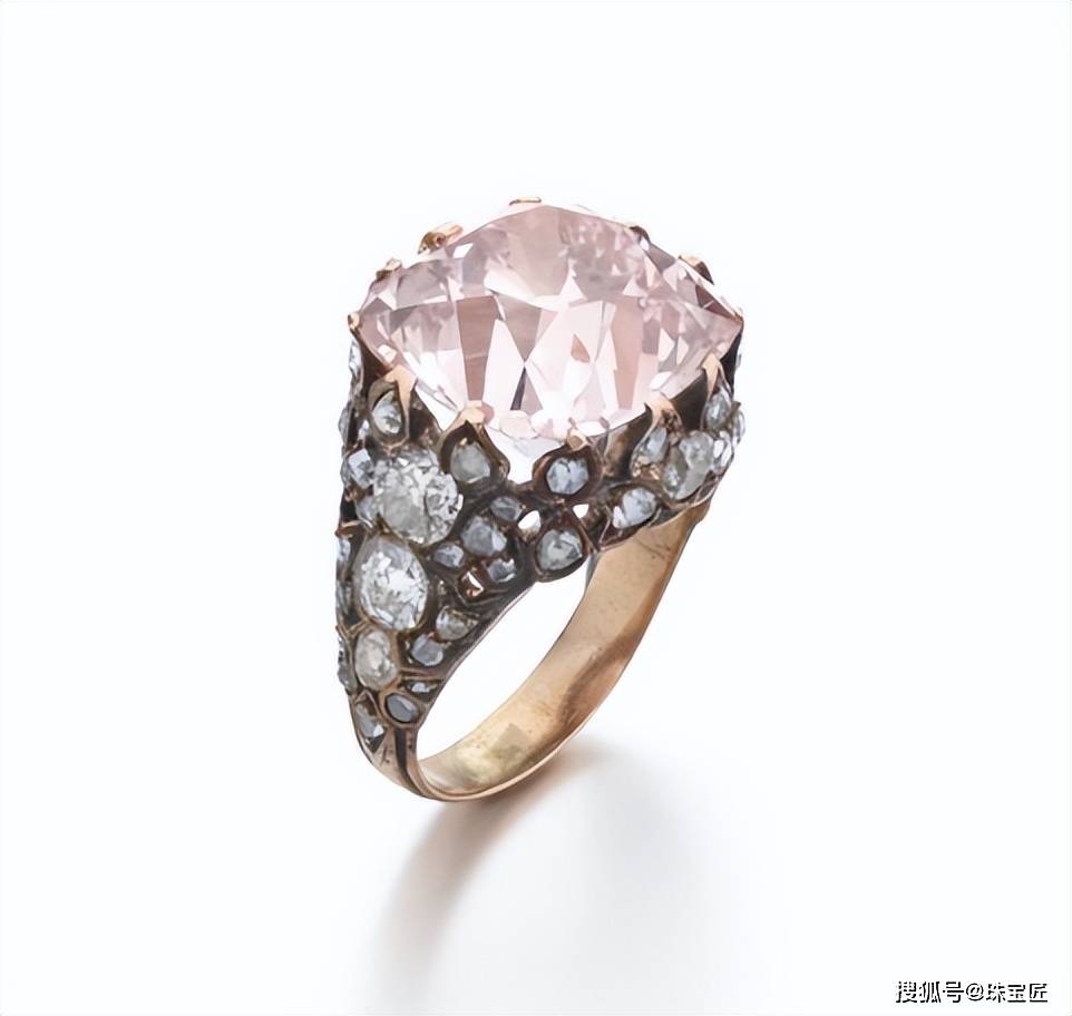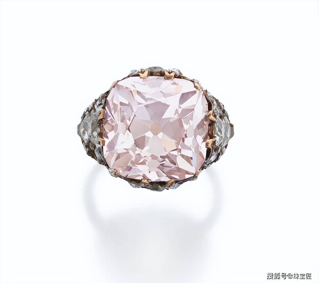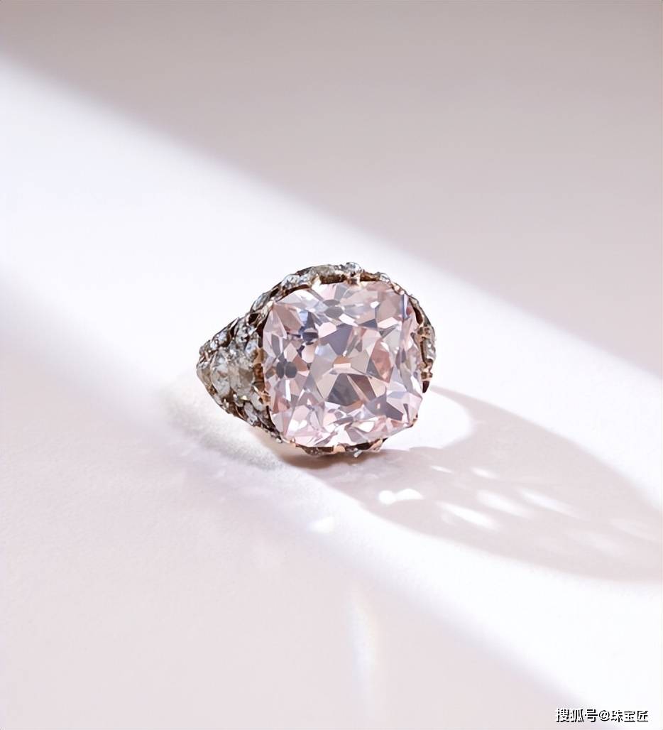 这枚粉钻戒指,主石是一颗重13.86克拉的枕垫形粉钻,颜色为浅粉色,净度为VS2,戒臂点缀大小不一的圆钻,款式奢华、复古;