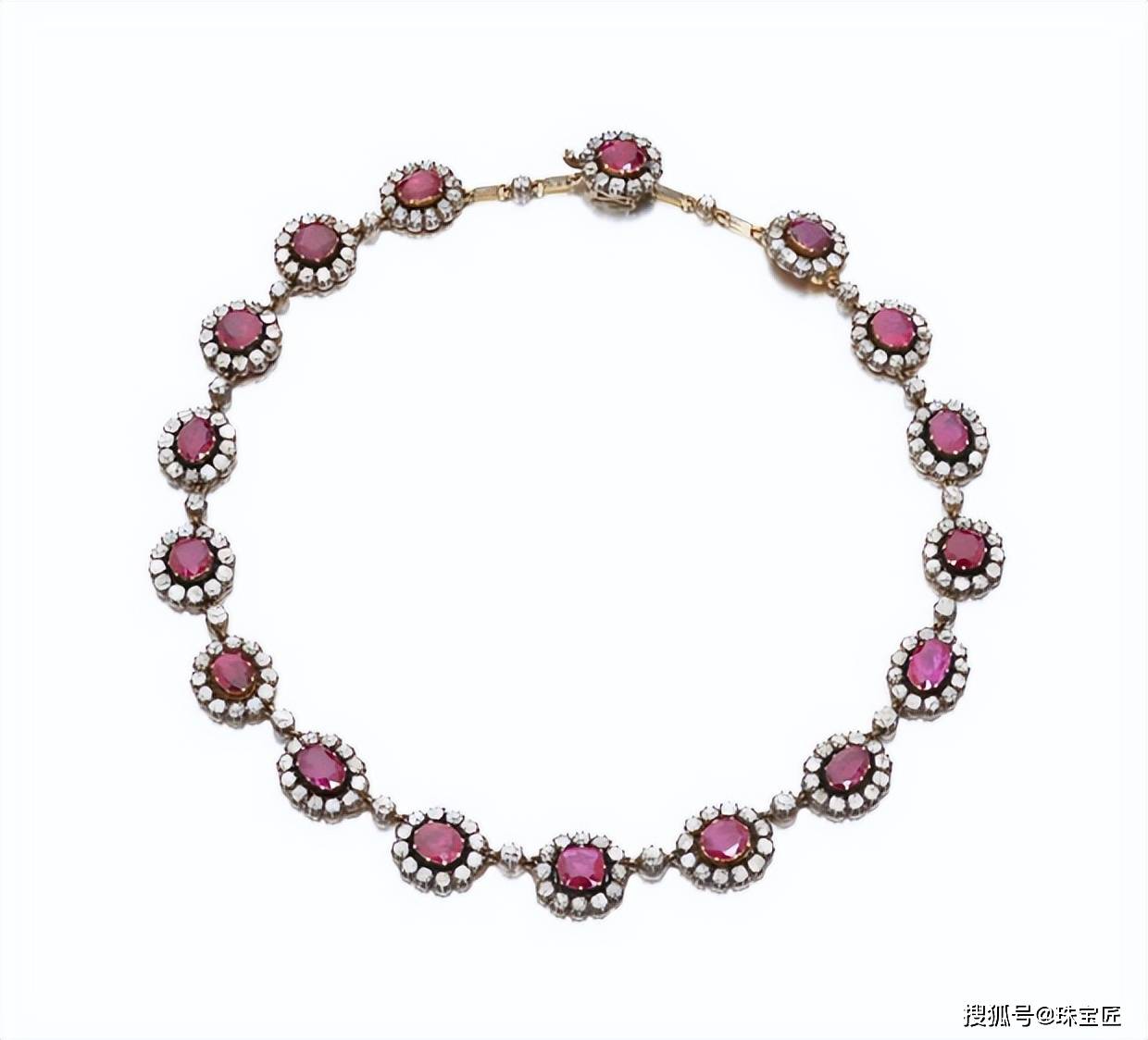 红宝石钻石项链,共镶嵌有17颗椭圆形和枕垫形切割的红宝石,外围一圈小克拉的钻石,款式浪漫、唯美,曾属于英国收藏家:克里斯蒂安·赫斯凯斯夫人。
