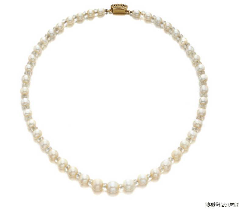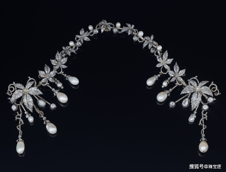 1840年,库尼贡德的后人用这些珍贵的天然珍珠,打造了这条华丽、唯美的藤蔓项链,1860年时,又打造了配套的珍珠钻石胸针,并作为传家宝在家族内世代传承。
