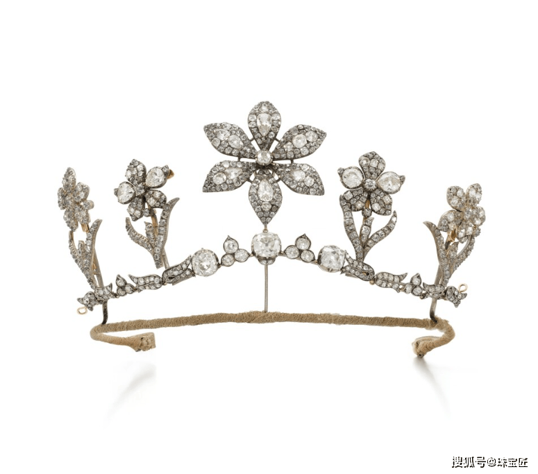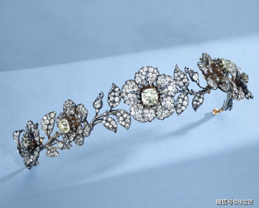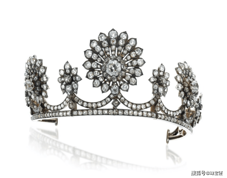 钻石冠冕,制作于19世纪,以当时流行的花卉图案为灵感,正中的那朵钻石花尺寸最大,镶嵌有6片钻石花瓣,左右两侧各镶嵌2朵钻石五瓣花。
