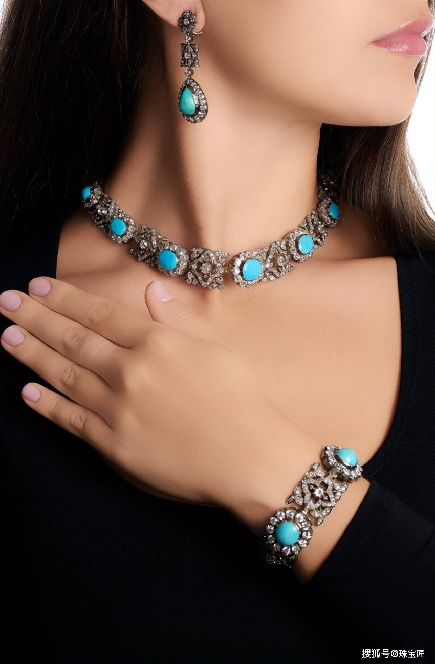 项链、手镯和耳环均采用统一的镂空四叶花设计,色调清新的绿松石与不同切割的钻石相映成辉,通过精湛的镶嵌工艺,共同构成了和谐而华贵的视觉美感。
