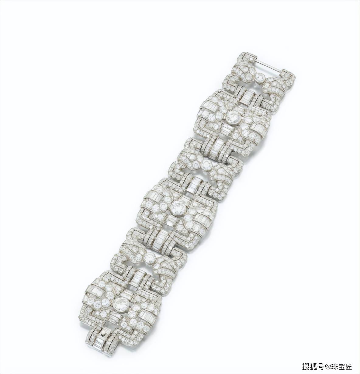 钻石手链,制作于1930年,由多块采用几何图案设计的镂空装饰板串联而成,其上点缀不同切割的钻石,通过密镶等工艺紧密排列,营造出璀璨夺目伟德国际victor1946的视觉效果,展现出那个时代对几何美学与钻石工艺的极致探索。