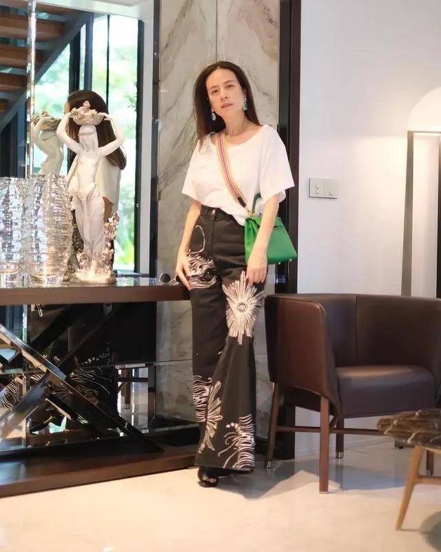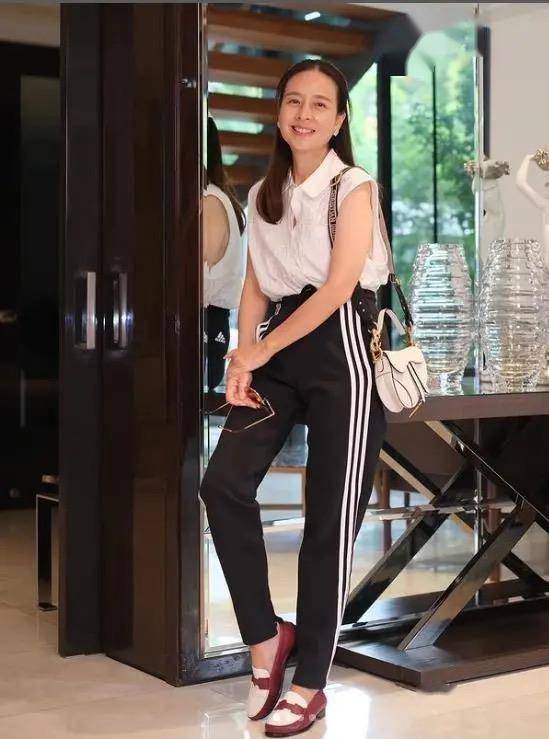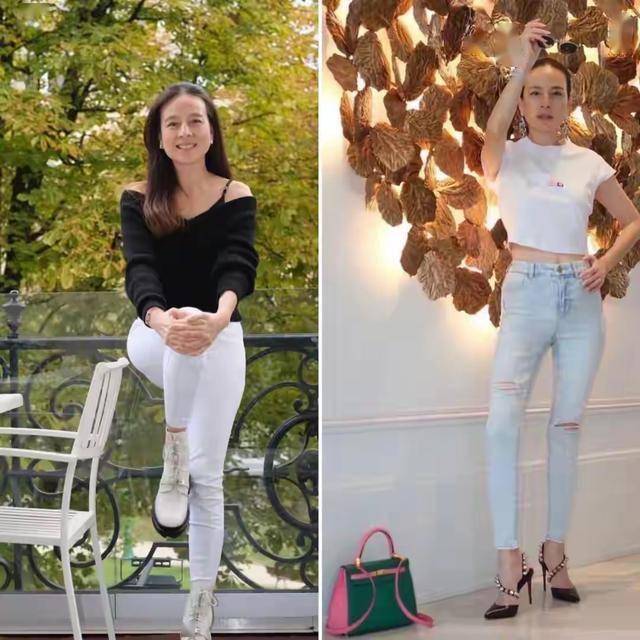 很多中年女人不敢尝试的紧身裤,却被伍伦盼轻松征服,搭配一字领上衣、露脐T恤,比年轻人还要时髦。