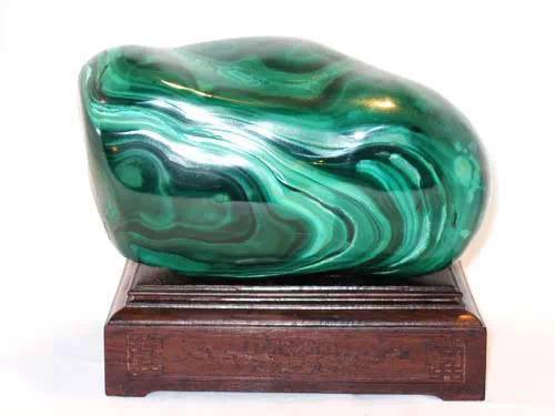 孔雀石呢,这个朋友们一见到这个名字,也许就会和孔雀相联系,对的,名字的起源就是因为石头的绿色与孔雀羽毛上的绿色差不多而得名。名字最早的来源于希腊,中国古代玉制品用料的一种。孔雀石因为是铜矿风化的产物,所以世界各国差不多均有产出,著名的就是俄罗斯、智利、澳大利亚、中国等等,一般玻璃光泽,不透明,硬度、密度均小,硬度2~4,密度2~2.4,韧性差,主要颜色绿色、蓝绿色、暗绿色等等,硬度过低,很脆,所以容易碎,也怕碰撞,有人称它为漂亮而脆弱的石头。做为玉石,孔雀石缺少玉石耐久性和坚硬的特点,可能正是这个原因使孔雀石的价格一般不贵。曾经有一块大约40多厘米长的这类原石,很大的一块料,最终才几百元出售。平时大家见的最多的孔雀石的DD大致为串珠、蛋面、项链、山子摆件之类的。