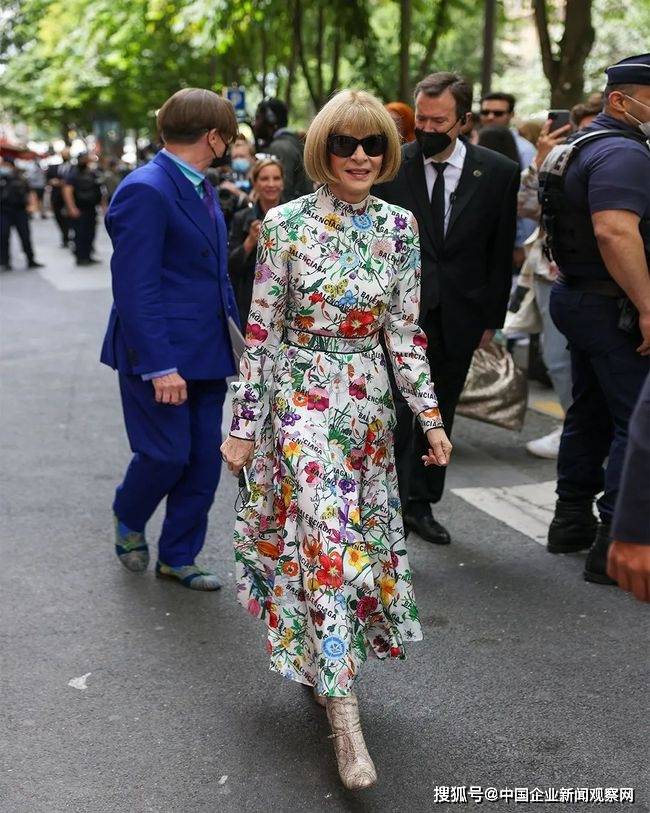 “女魔头”Anna前阵子看秀,穿了近期最热门的Gucci X Balenciaga联名印花裙。