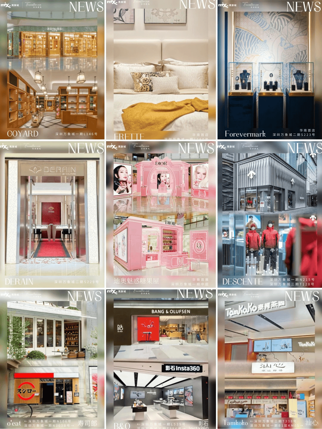 近日,深圳万象城在社交平台分享了春日新店合集,11个品牌涵盖家居、珠宝、运动、餐饮、数码等品类,分别为法国奢侈品牌GOYARD、意大利百年奢华家纺品牌FRETTE(华南首店)、专注于高端钻饰的珠宝品牌DERAIN、珠宝品牌Forevermark(华南首店)、日本高端户外运动品牌DESCENTE迪桑特、寿司朗、中国本土西餐品牌O’eat、源自丹麦的高端视听品牌B&O、影石Insta360、泰式茶饮Tamkoko、汕心潮汕甜汤。