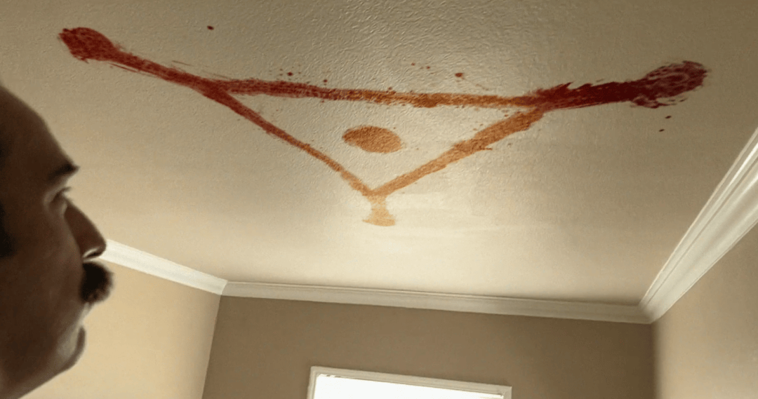 当我们顺着死者发白的眼球向天花板望去时,就会看到一个用鲜血绘制的诡异三角符号。