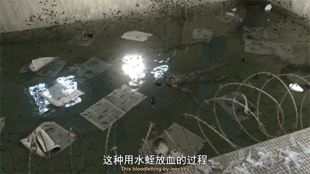 并且每个桶上都写了他们的名字,标着“GOING”“GOING”“DOWN”的字样,用以表现放血的刻度。