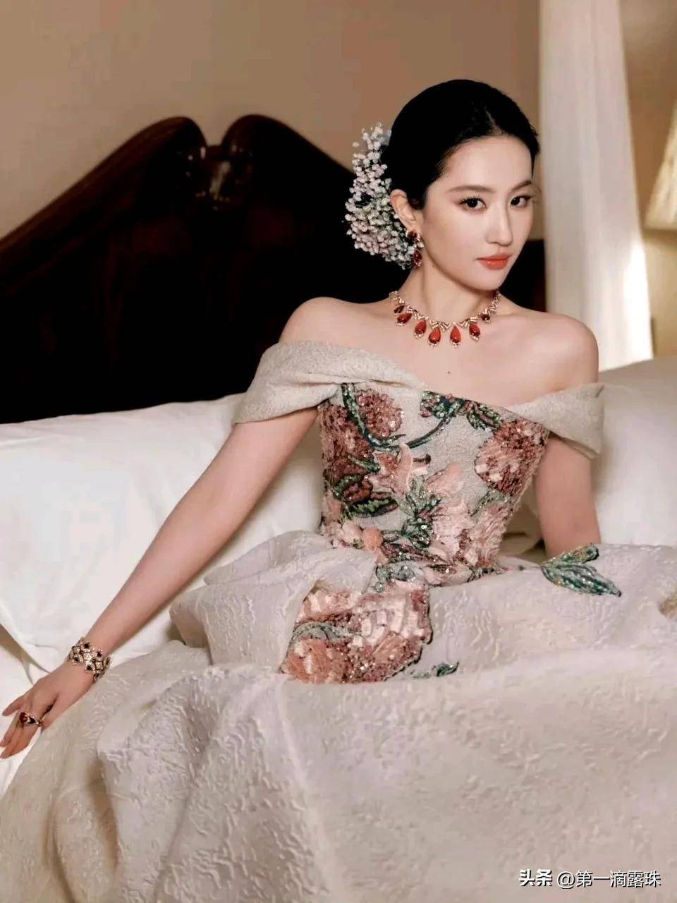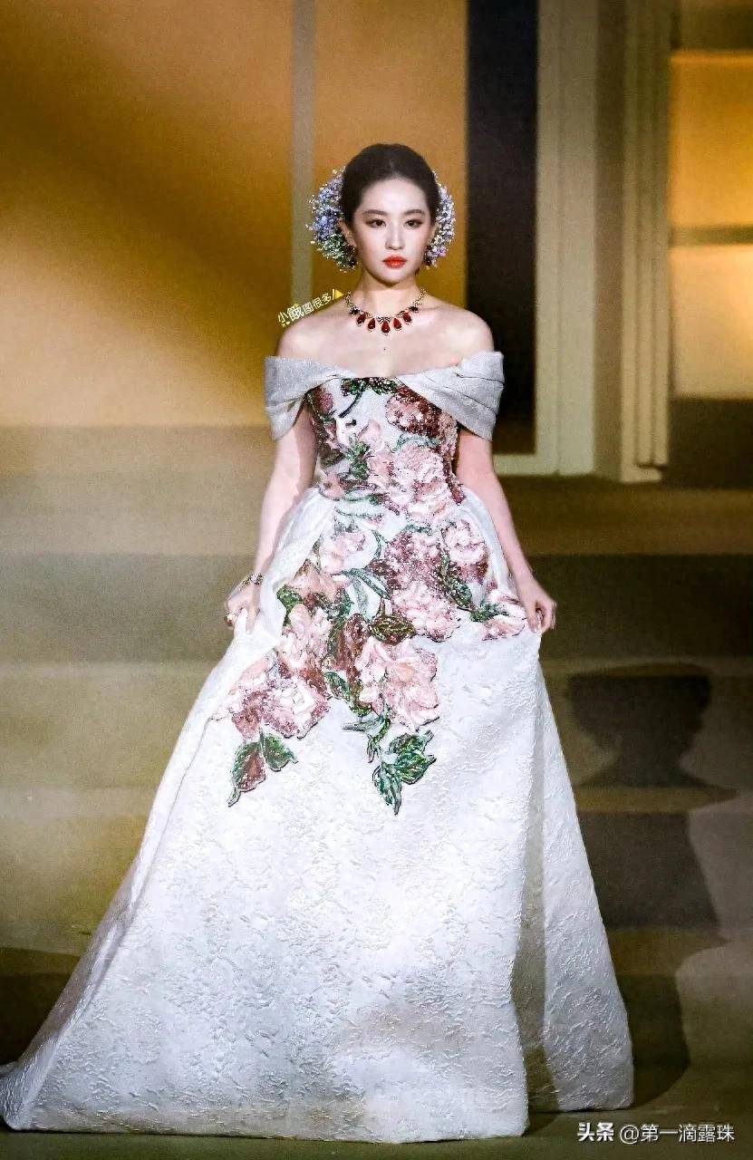 刘亦菲身着Elie Saab 2025秋冬高定花卉刺绣长裙,裙身由工匠耗时三个月手工缝缀3000朵真花,行走间裙摆摇曳如“移动花园”,完美呼应盛典主题。