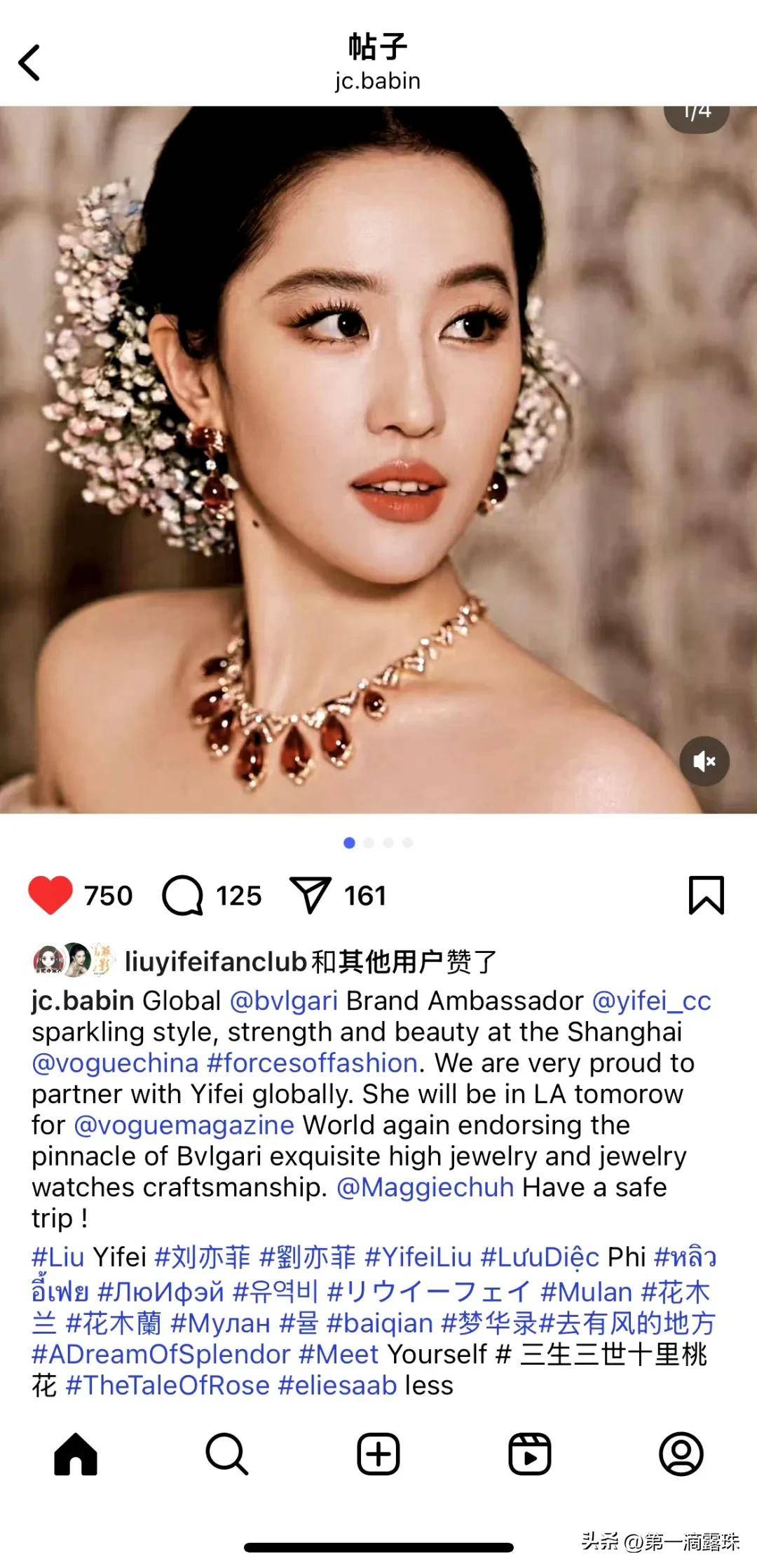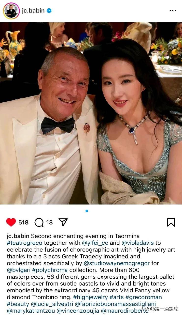 盛典结束后,宝格丽全球CEO Jean-Christophe Babin在个人社交平台发布刘亦菲的造型图,配文里的标签密集到让粉丝自愧不如——不仅有中、英、日、韩等多语言版本的名字标签,还贴心附上《花木兰》《梦华录》等代表作标签,连#VOGUE20周年# #BVLGARI高珠# 等关联词都一个不落。