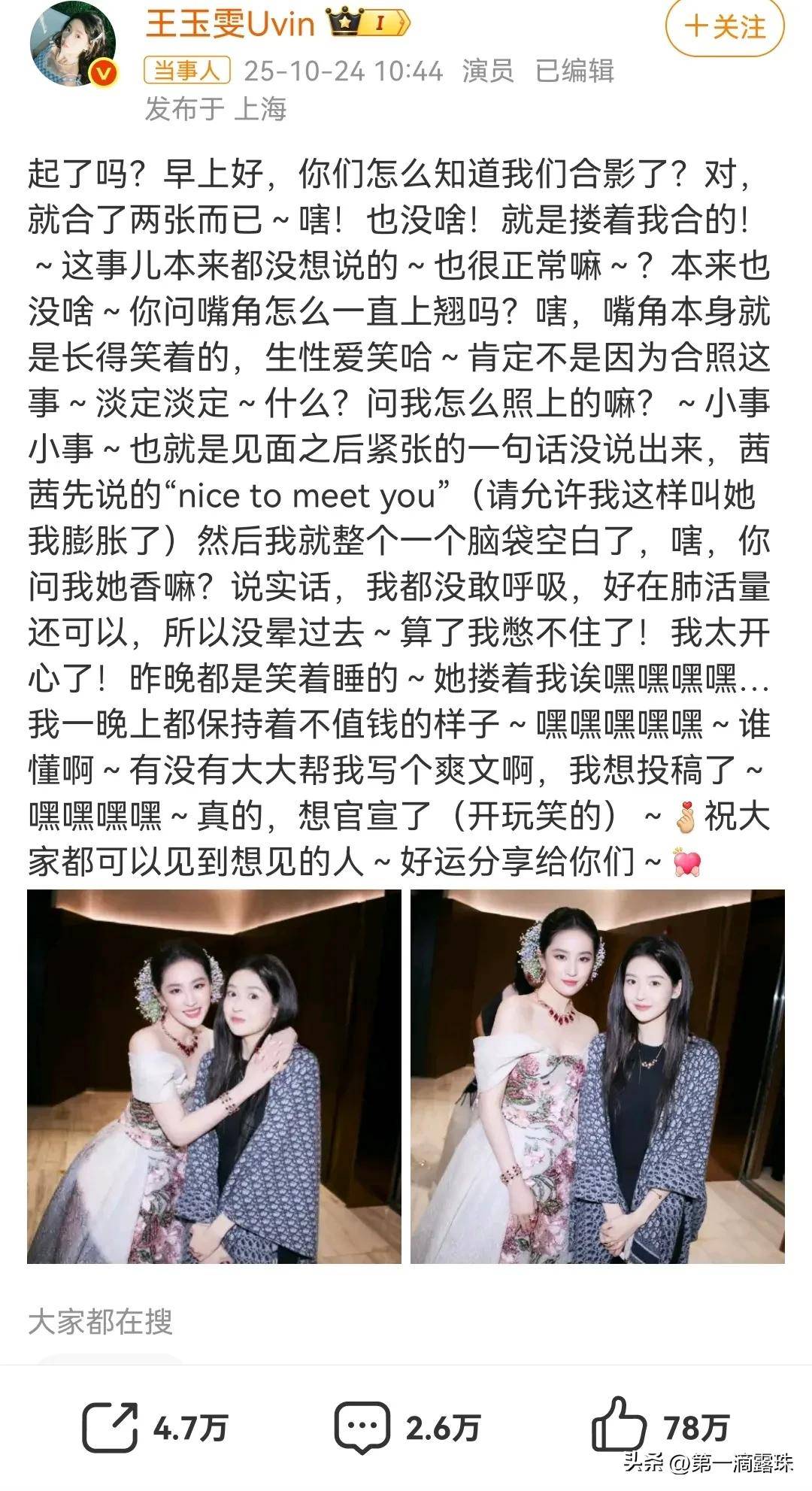 演员王玉雯与刘亦菲合影后,次日激动发布近500字小作文,讲述自己追星成功的“狂喜暴击”。